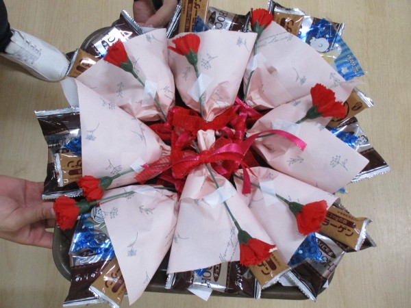 私達職員から皆様に、お菓子でミニブーケを作りました!