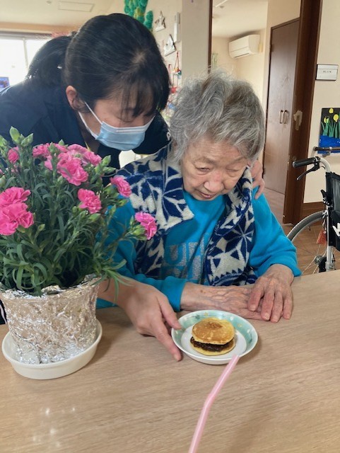 今回はキレイなカーネーションと、前回のブログで作ったどら焼きと一緒に記念撮影をしました♪