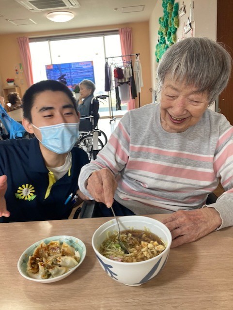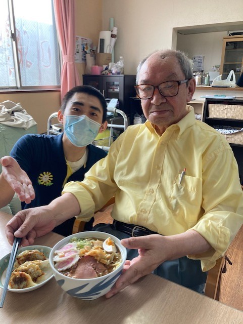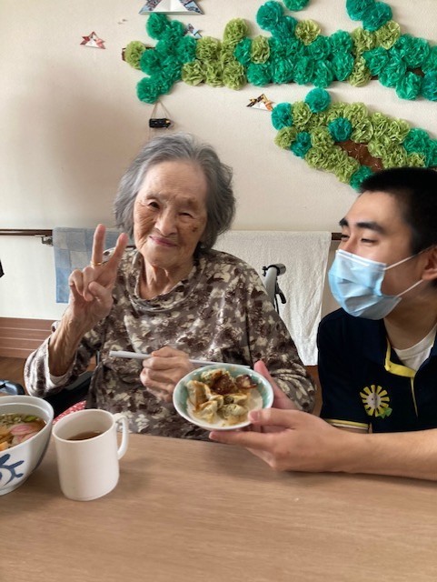 手作りのラーメンと前回のブログでも紹介した、ホームの皆さんと一緒に作った餃子です!
