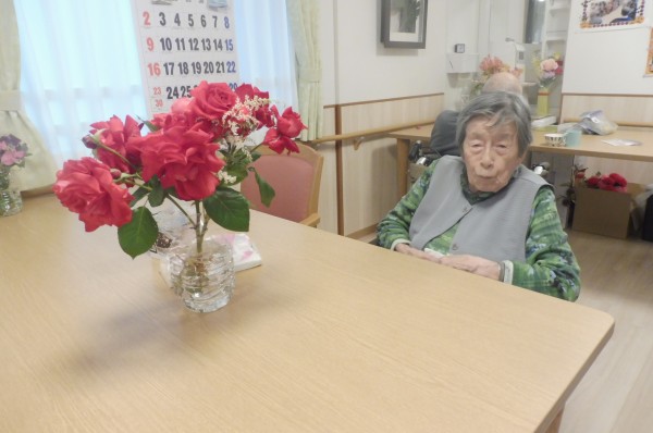 女性利用者様が真っ赤なバラを見て『綺麗だね~、素敵だね~』ととても喜んでいらっしゃいました。