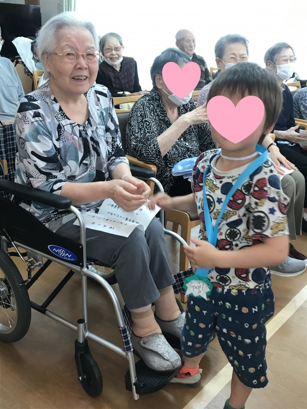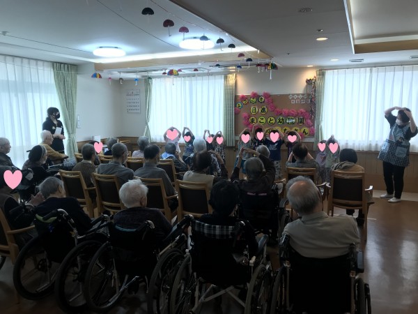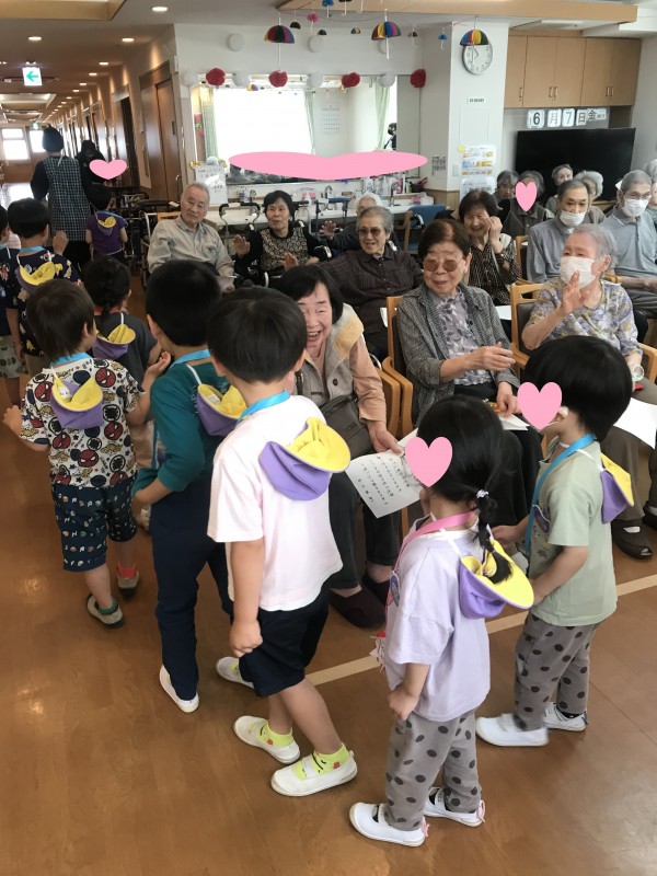 幼稚園のみんなと入居者様・職員一同で歌を歌ったり、幼稚園の皆に施設での生活等のお話や逆に幼稚園の様子を話して頂いたり、