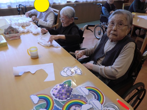 真剣に、虹やアジサイを切ったり、てるてる坊主の顔を描いたり。