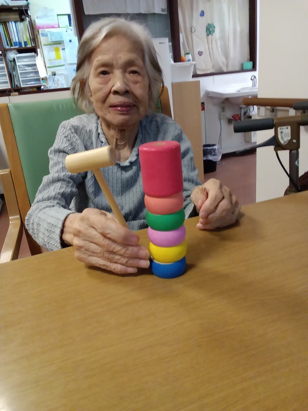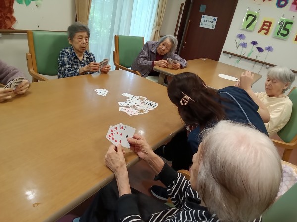 トランプやダルマ落としやボ-ル投げなど様々なゲームを通して入居者様同士・スタッフとのコミュニケーション作りを行っています