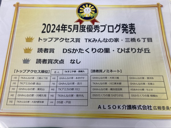 ★☆三橋6丁目のブログが『トップアクセス賞 』で表彰5月度優秀ブログ発表2024年✨ 『みんなの家 三橋6丁目 介護ブログ』☆★
