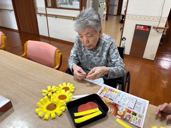 第二工程…葉の上にひまわりを貼っていただきました。その前のひまわりを作る工程では、「難しいなあ…」などと仰り、