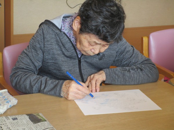 塗り絵は好きな方が多く、ちょっとした空き時間に行います。