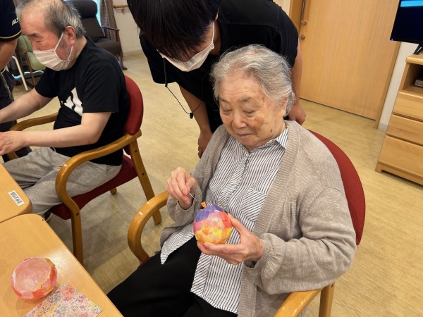 作成した風鈴は、風船を膨らませて和紙を周りの丁寧に貼って乾かしていきました。