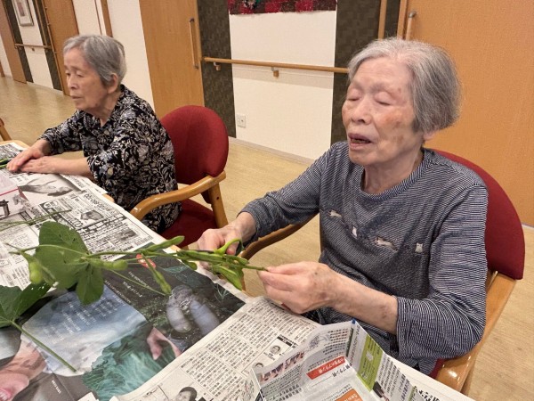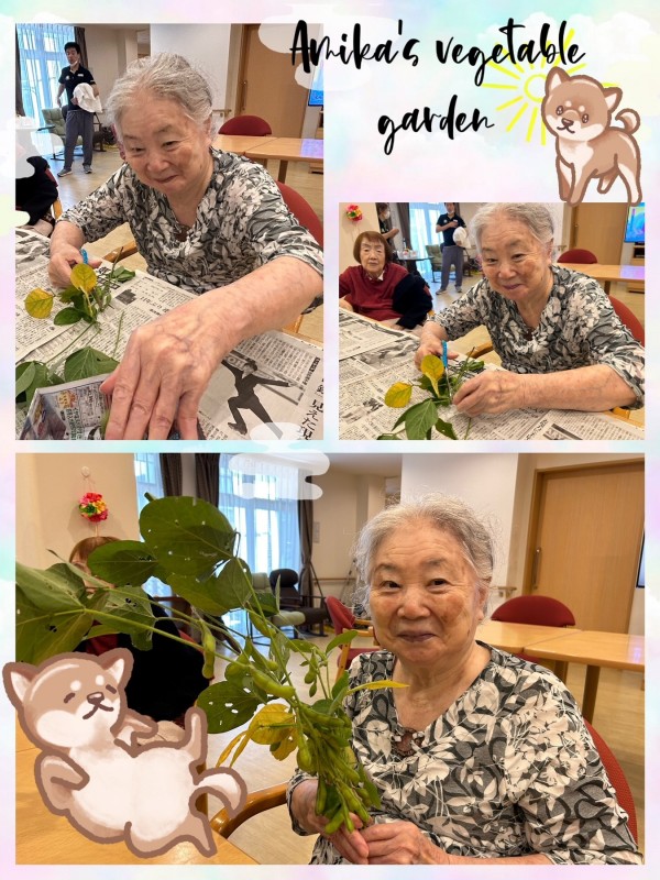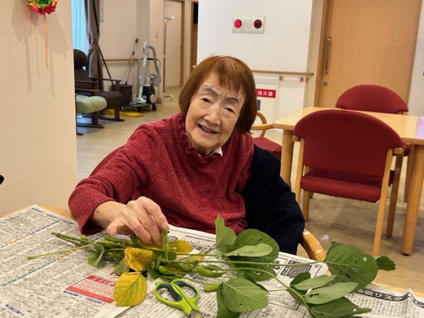 入居者様のご家族に「早く取らないと大豆になっちゃうよ、もう食べ頃だね・・」と嬉しいご指導を受けました。