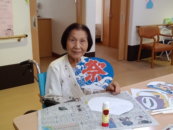 本日のレクレーションは、うちわ作りに挑戦して頂きました。皆さん、とても初めてには思えないほど上手に仕上がりましたね。もう職人さんですね!笑