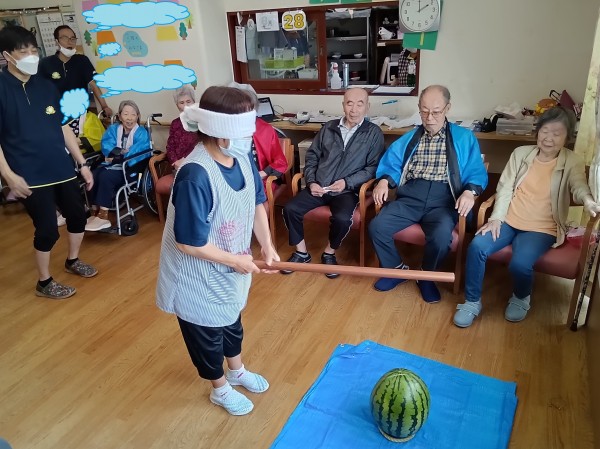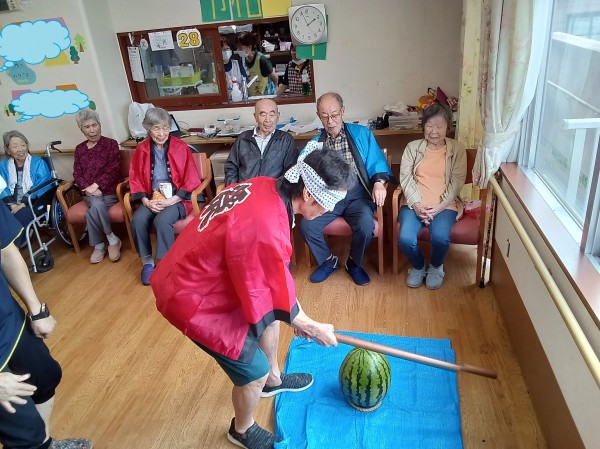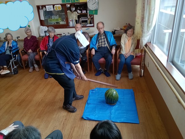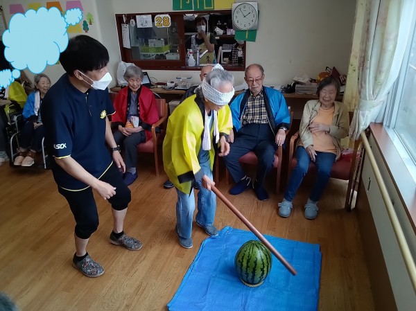ご利用者様・職員で協力し、大きなスイカを割りました('ω')ノ