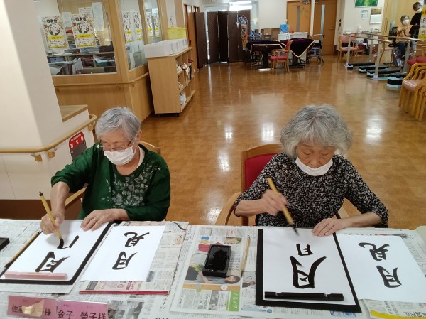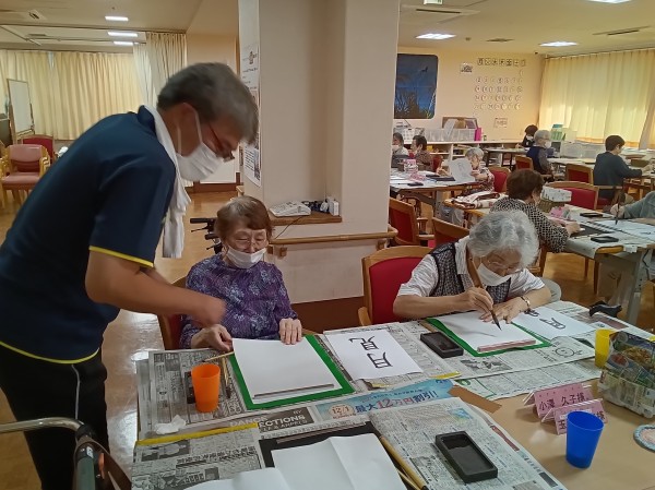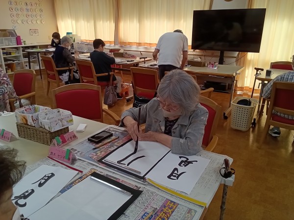 中には職員や周りのご利用者様に「どれが良い?」と見てもらっている方もいました(^^♪そして更に中には、納得の行くまで書くため半紙の追加をされている方もいました(笑)!