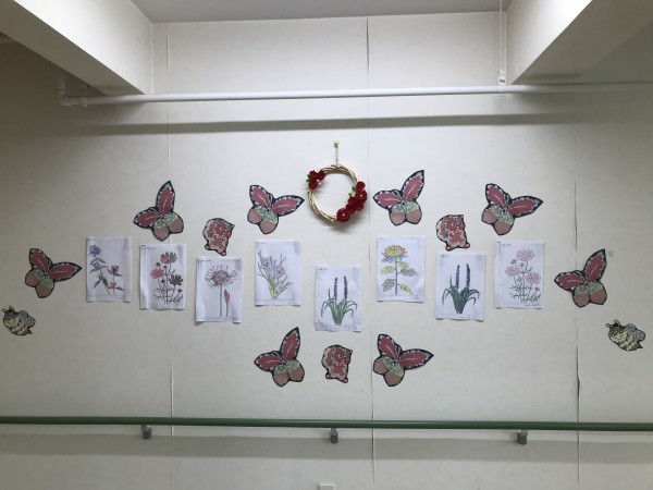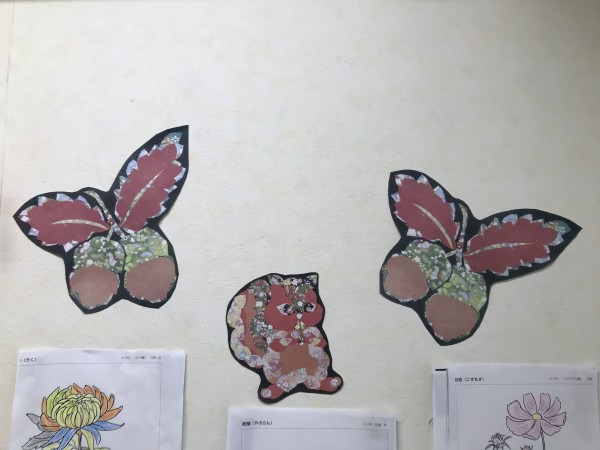 まずは、秋に合わせて入居者様に切り取ってもらったり塗って頂いた絵をかざりました(写真↑)