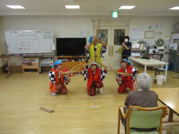 本日は『いきいきサークル 玉すだれ』の方たちに、敬老会第1弾として       おめでたいイベント『南京玉すだれと銭太鼓』を催して頂きました!!!