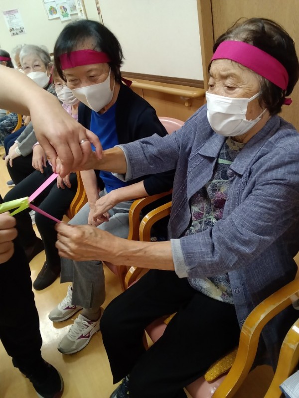 職員と紙テープ同士で引っ張り合いしていただき、