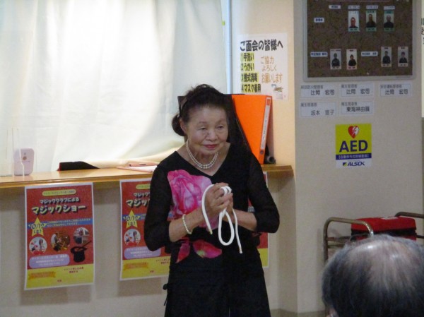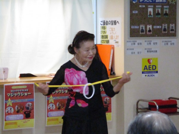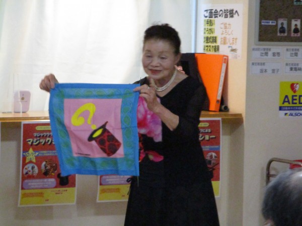 次は紐を使った手品!紐を輪っかに通し・・・。お洒落なハンカチが出てきました???
