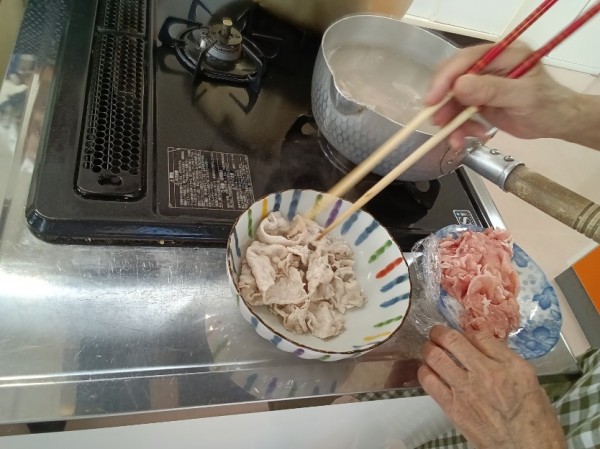 今日はアレンジレシピで、ゴマとクルミを一緒にすり、具材には豚のしゃぶしゃぶも追加されました。