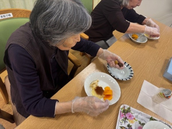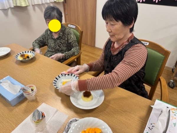 職員がプリンとフルーツ(柿、バナナ)を分けてよそっておいて自分で飾りつけをするスタイルだそう!