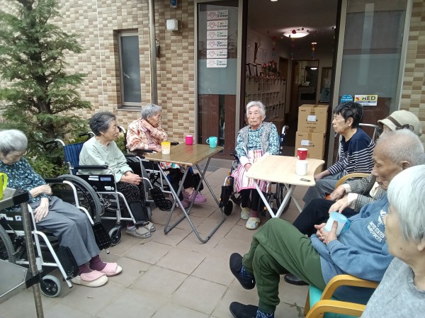 施設の玄関前ではありますが、秋晴れの爽やかな空気の中で飲むお茶はいつもとは一味違う??