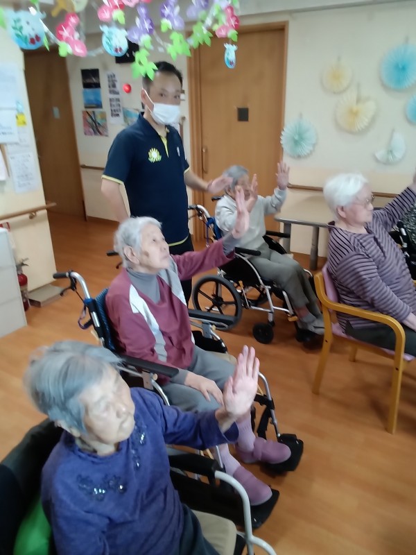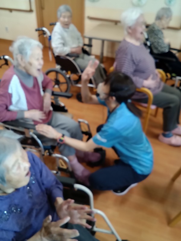 先生や、スタッフが協力して体操して、笑顔になっているのは微笑ましいですね(笑)