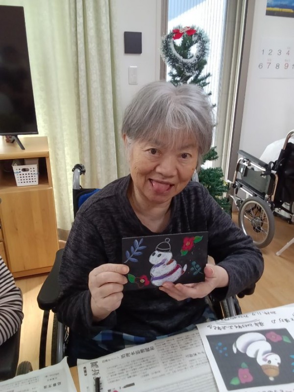 ハガキサイズの黒板に講師の方が描いて下さった可愛い蛇を特殊なチョークで色を塗っていきます。