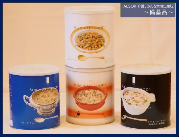特に〈食料品〉は〈水〉同様最も重要品で、ご入居者様全員分と職員分を備えております。