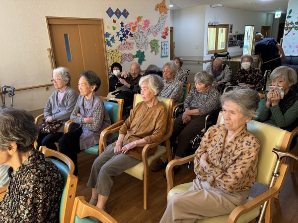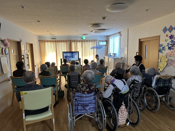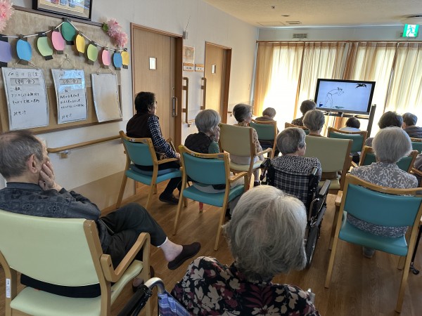 こんにちは、グループホームみんなの家川崎新百合ヶ丘の介護ブログです。今回は、少し前に行われたボランティアの方による紙芝居のご様子です。いつもボッチャで来て下さっておられる方が紙芝居で入居者の皆さんを楽しませて下さいました。