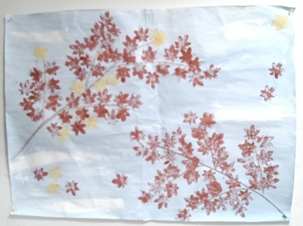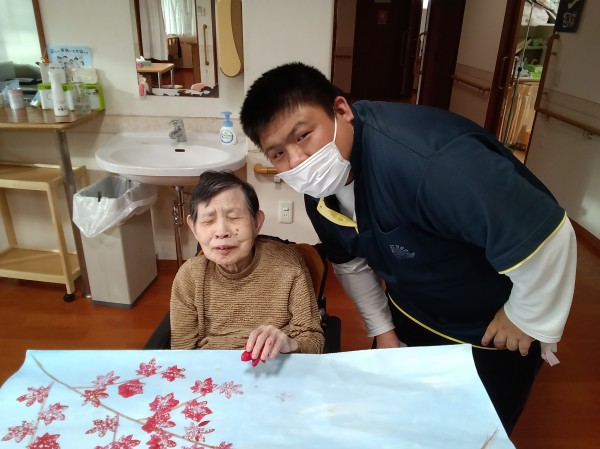 スポンジを紅葉の葉に型とって、利用者様には葉っぱを散りばめるようにどんどん判を押す作業をしていただきました(#^^#)