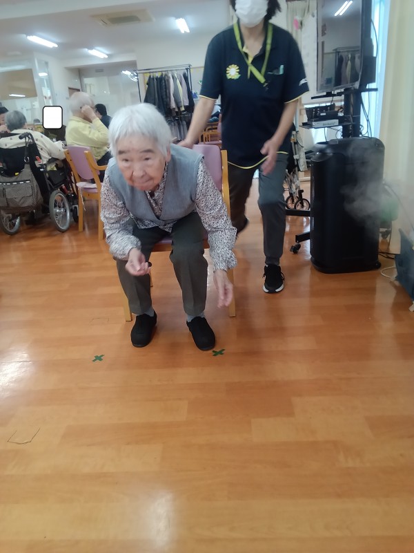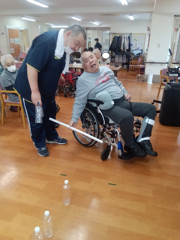 今日のレクは、ボトル倒しです。