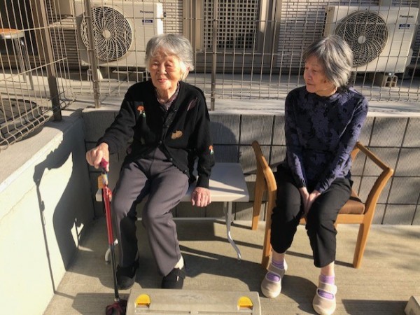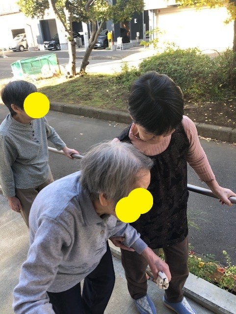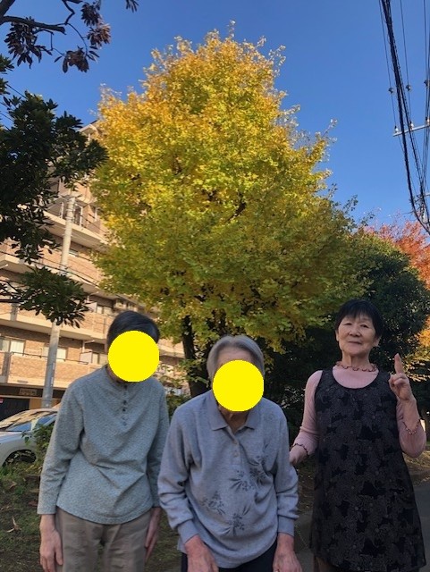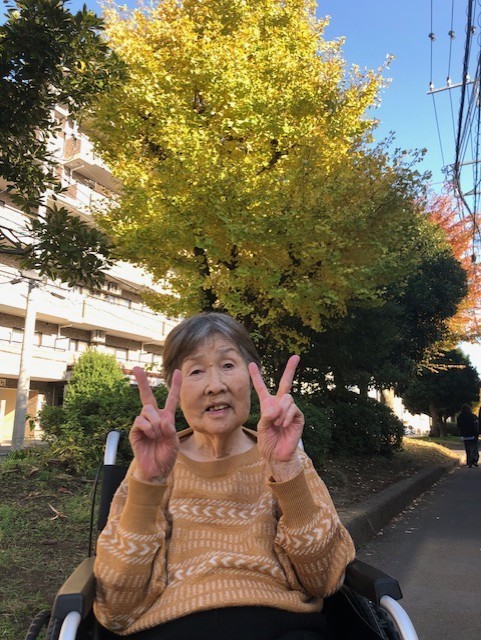 外に出ることにとてもうれしいと喜んでくださいました!イチョウだけではなくで駐車場側の日光が差し込む場所でしばらく外気浴もして頂きましたよ!近所の方が声をかけて頂いてあいさつしたり、交流も出来て良かったですね!