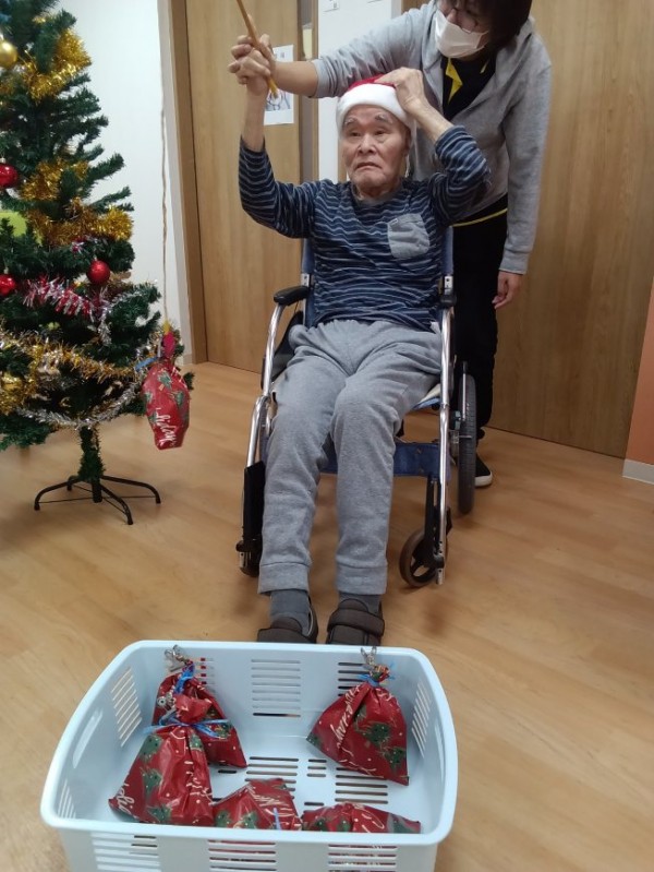 スタッフ、ご利用者様と一緒にケーキ作り。クリスマスソングを合唱、お菓子釣り。