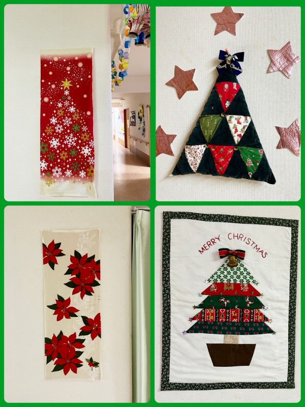 3階には季節ごとの和柄の絵が書いてある素敵な手拭いのシリーズがあります。壁に貼って楽しんでおります。12月はクリスマスツリーとポインセチアです。