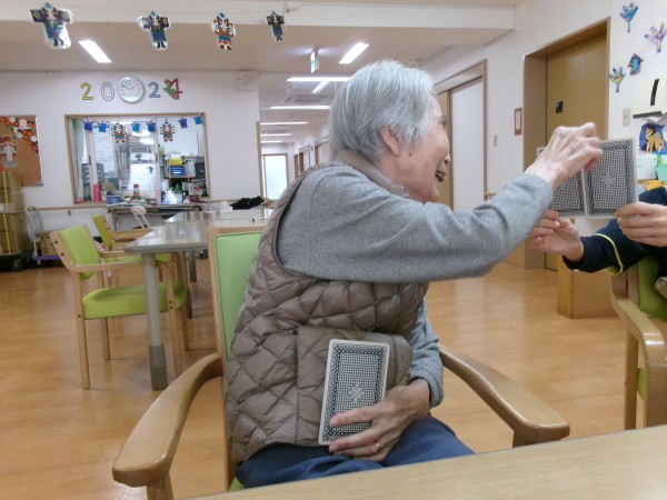 最初に、でかいトランプを使ってババ抜きを始めました。皆さん、カードを選ぶときにワクワクした表情を見せ、自然と笑顔が広がります。時々、ババを持ってしまった方もいましたが、笑い声が絶えず、とても楽しい雰囲気でした。