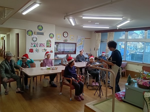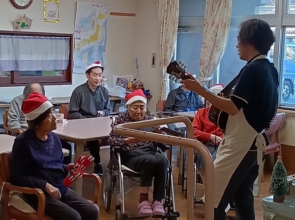 ご利用者様、サンタ帽をかぶり楽器を片手に