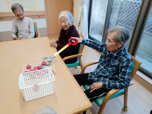 今日は30センチのトングを使ってお手玉を掴むレクリエーションを行いました!