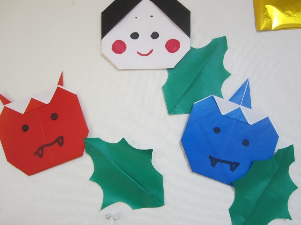 さまざまな色の折り紙で鬼と福を作成しました\(^o^)