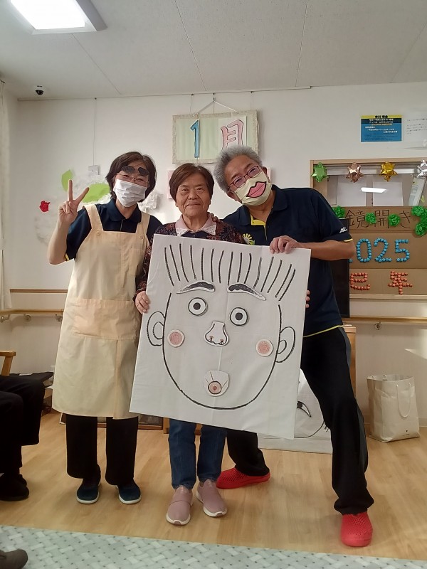 わ〜!大きい!!各ユニットのご利用者様代表3名様が大きな福笑いに挑戦です♪なかなか個性豊かな仕上がりにご利用者様も職員も大笑いでした(≧∇≦)/