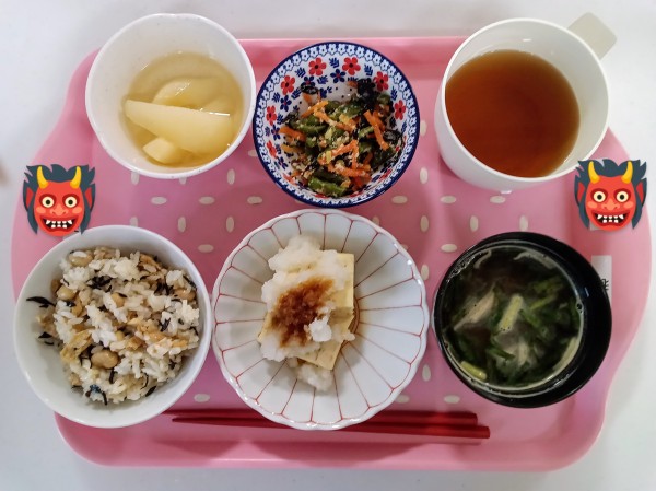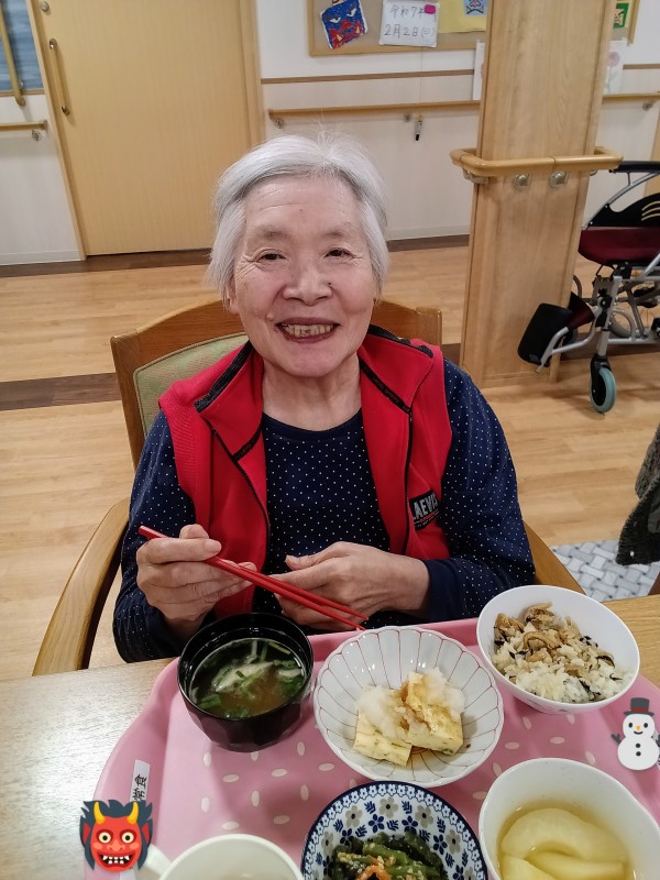 節分といえば豆まきで邪気を払ったり、縁起物の恵方巻きを食べたりしますが、ホームではお昼に1年間の健康と幸せを願って、節分ランチをいただきました♪