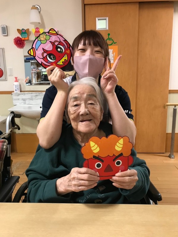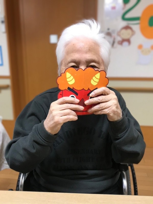 ご利用者様たちは鬼のお面を持ってポーズを決め、「鬼は外、福は内!」と笑顔で写真撮影。