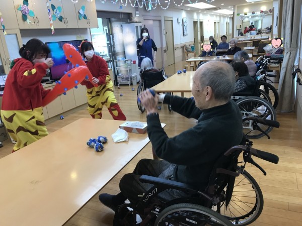 鬼の登場に目を真ん丸にして驚く利用者様もいれば、玉を持って今か今かと待っている利用者様も(笑)