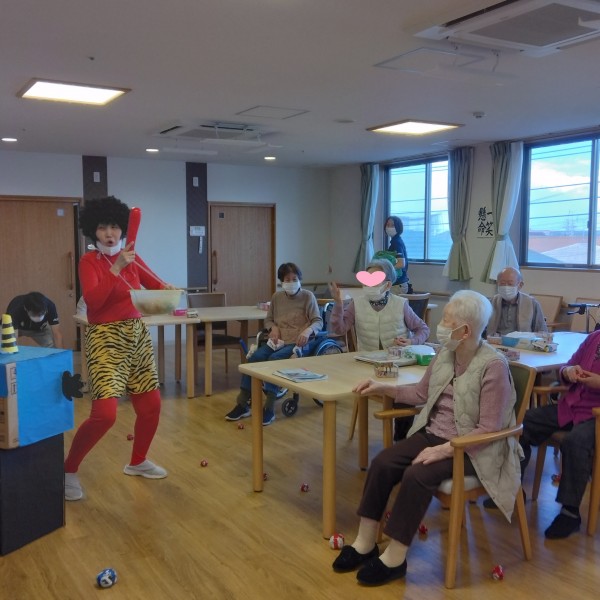 豆まきについて「そもそも「節分」とは、鬼に豆をぶつけて追い払い…」と節分についてのお話を聞いたあとは、じゃんけん大会です。人型鬼もちゃっかり参加しています。