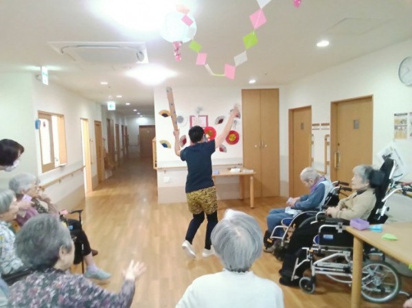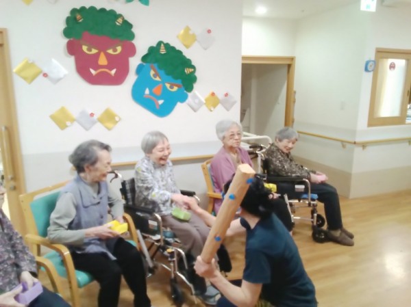 こんにちは! グループホームみんなの家・川崎新百合ヶ丘の介護ブログです。節分の日のパート2です、1階から追われた赤鬼と青鬼が2階に出没、利用者様が協力して鬼を退治しました、これで間違いなく災いや病気にならずに元気に過ごされる事でしょう。鬼退治!大成功に終わりました。