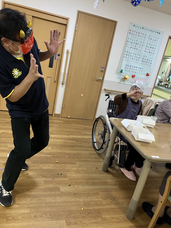 鬼が登場しご自分たちで作った豆を鬼に向かって投げています。