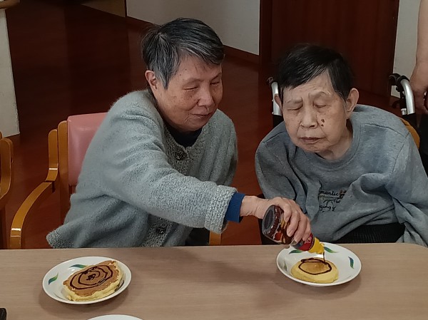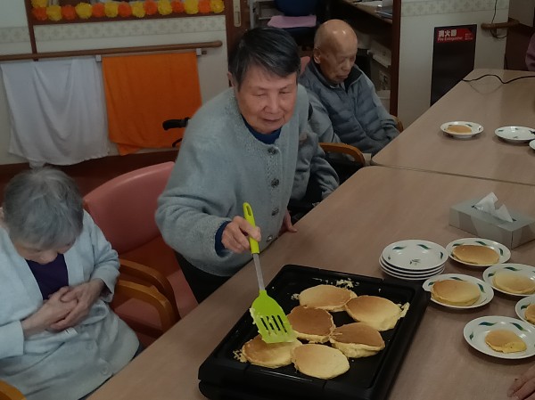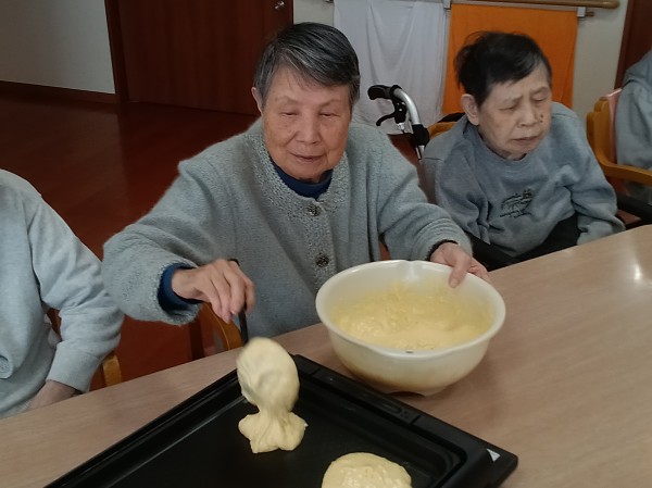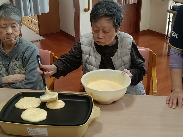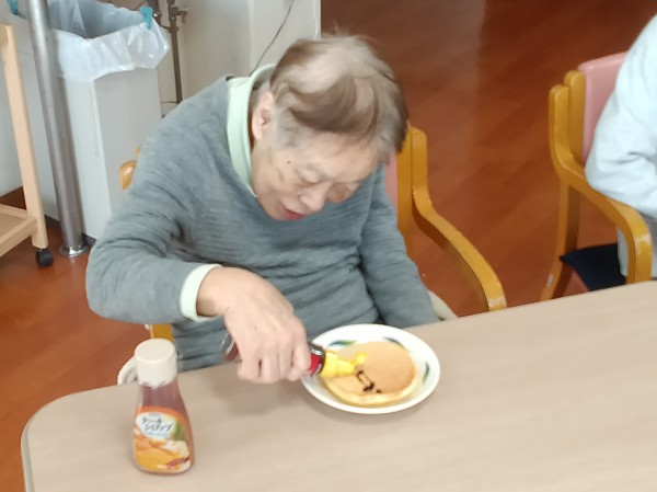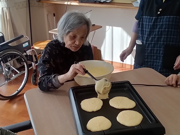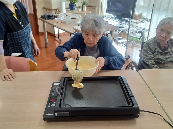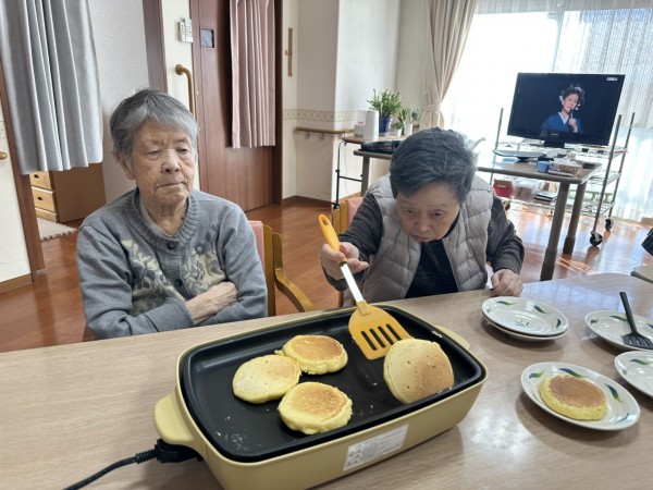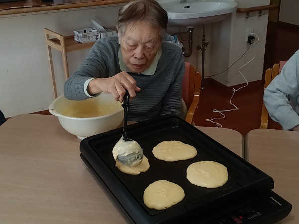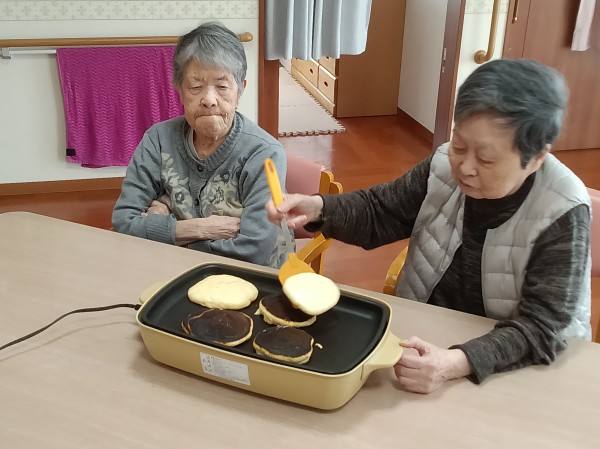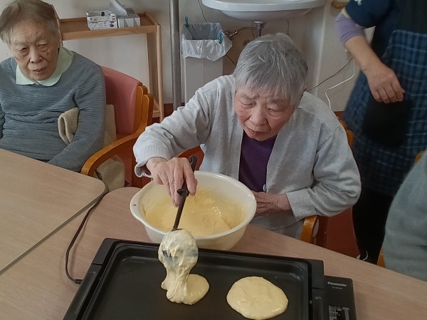 先日1階・2階合同でおやつレクを行いました。今回はホットケーキ&たい焼きです!(^^)!