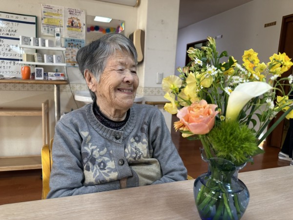 「みんなにもきれいなお花見てもらいたい」と仰り、フロアにお花を持ってくると香りを楽しまれ、「きれいねえ。あれ?この花はなんだろう?」、「昔は庭がお花でいっぱいだったわ。」と、他のご利用者様達と会話に花を咲かせていました❁
