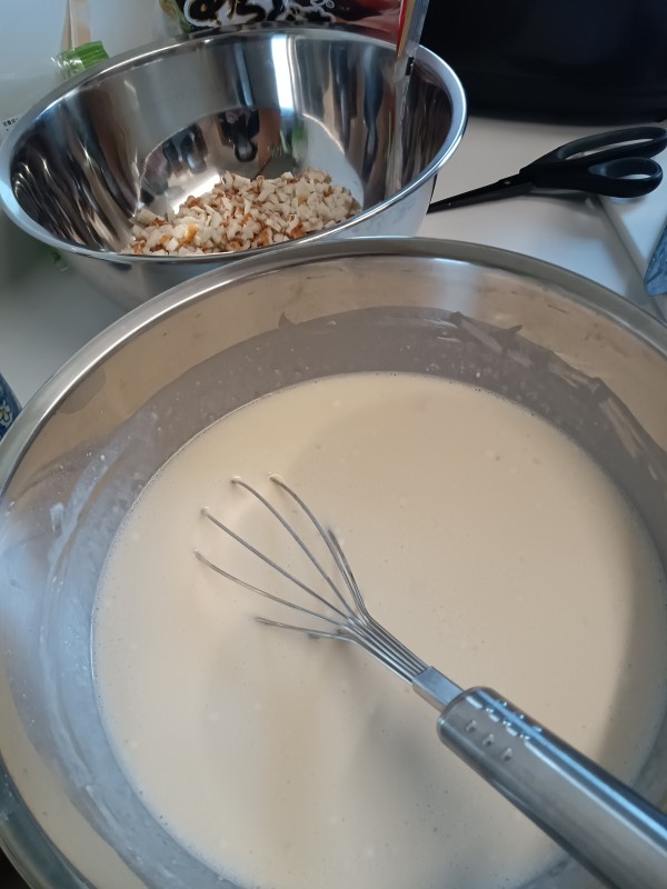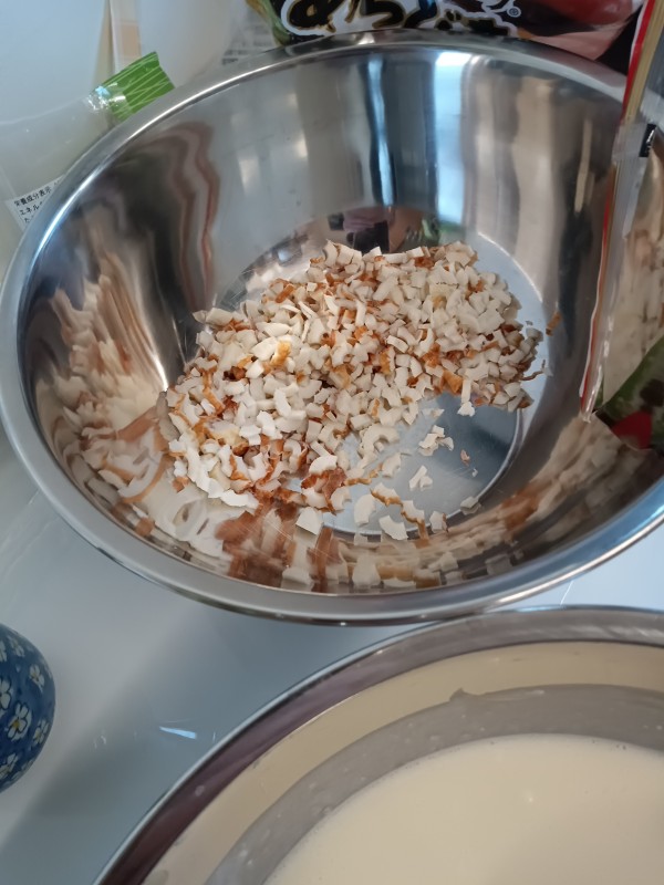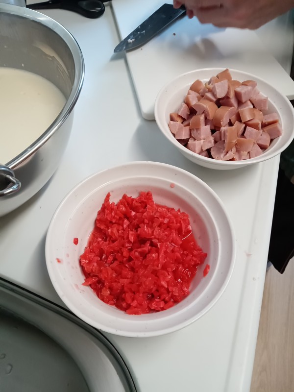 生地を流し込み、ウインナーを入れ、しょうが、蒲鉾をのせるたびに、