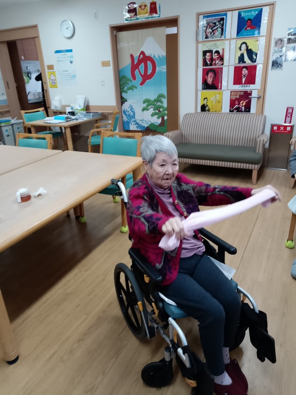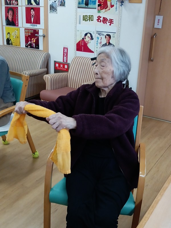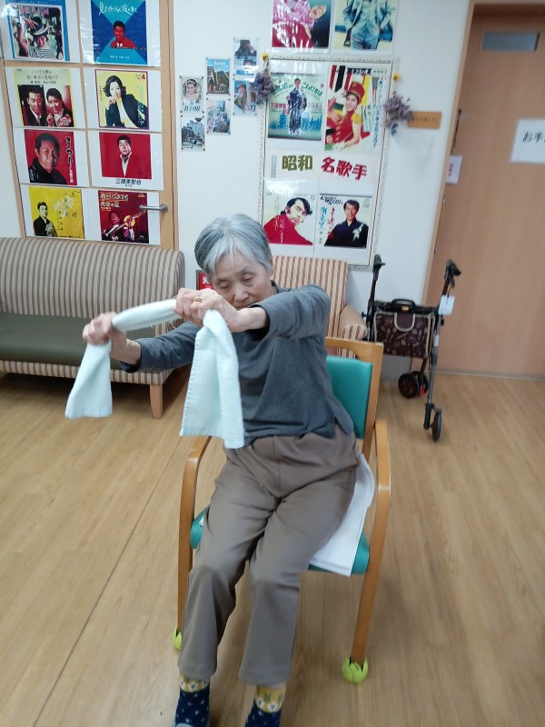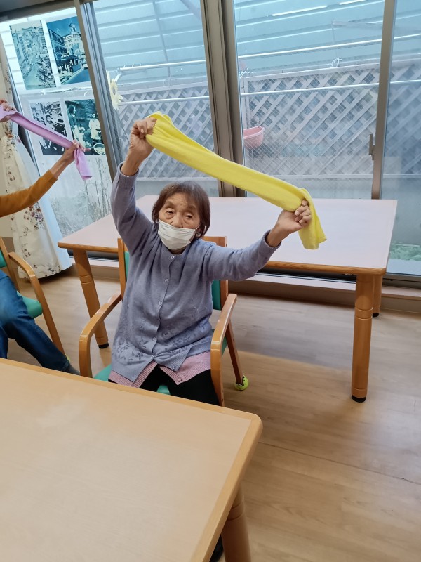 こんにちは、皆さん! 今日のレクはタオル体操で、シンプルながらも心がほっこりする時間を過ごしました。
