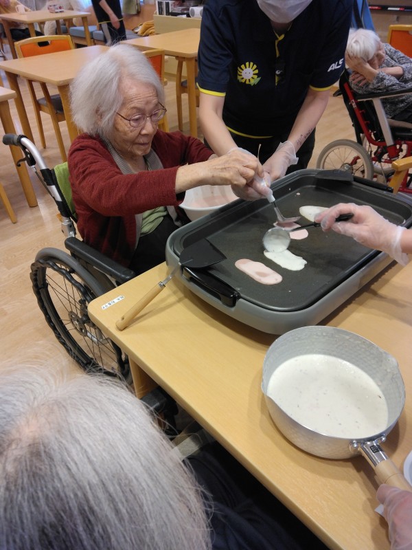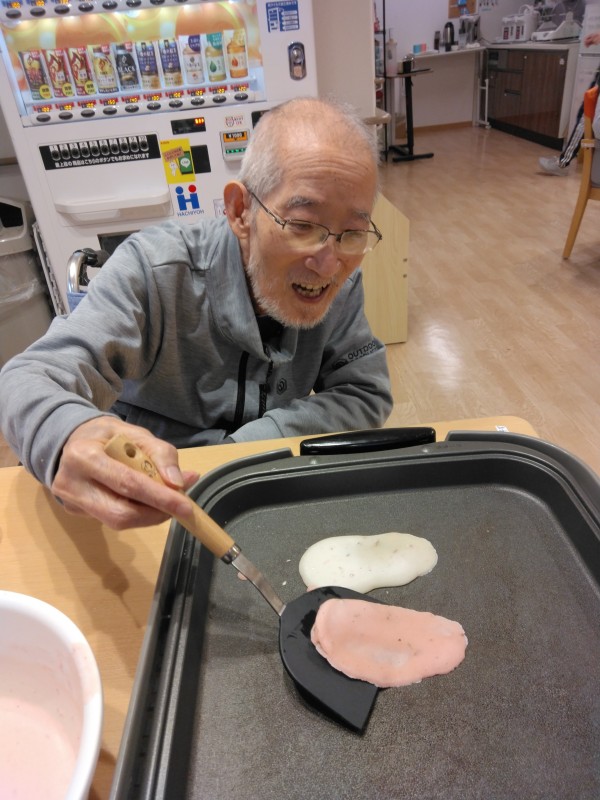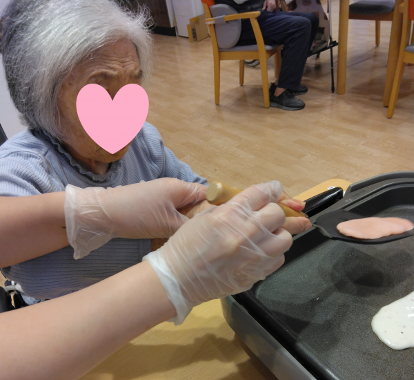 ひな祭りレクの桜もちを焼いている様子です(#^.^#)