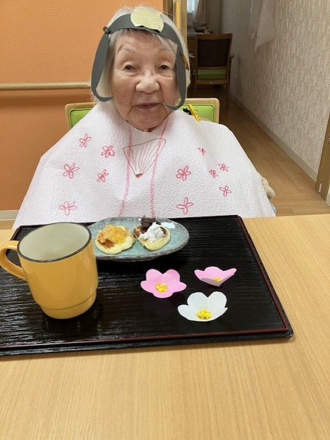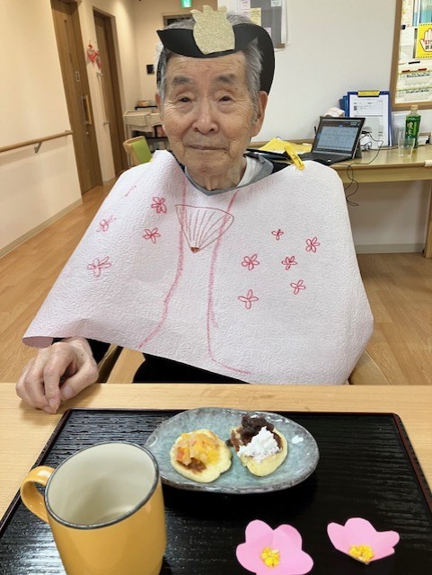 ♪灯りをつけましょぼんぼりにぃ~♬と歌いながら職員が紙で作った着物に冠のお雛様風ぷちコスプレで記念写真。