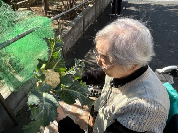 収穫は職員がお手伝い「凄い、立派ね・・」「こんなに、丸くなって・・可愛いわ・・」と大絶賛でした。