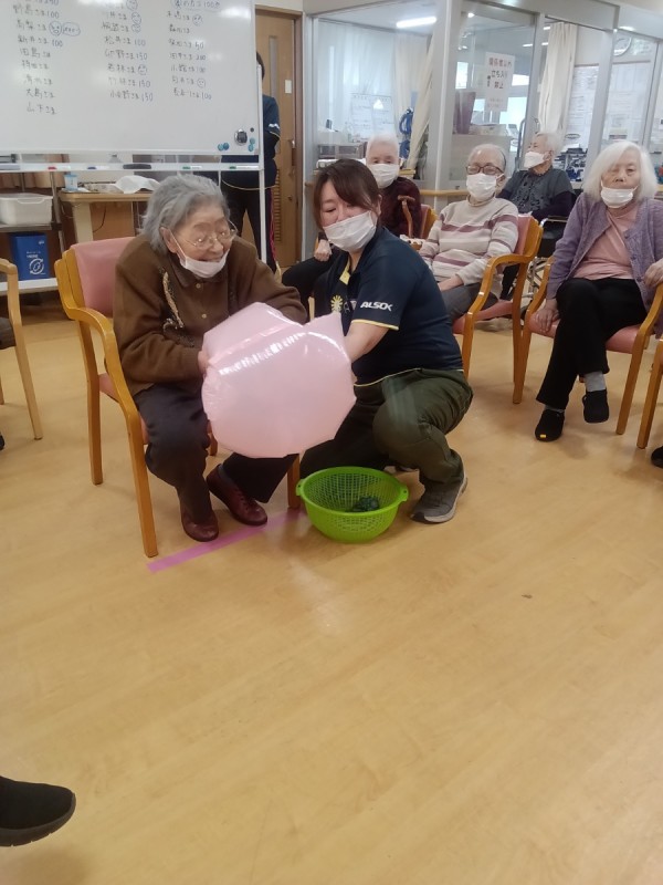 職員がビニル袋の口を縛った部分を握っているので、「一度、手を離して両側から勢い良く挟むんですよ~」と声掛けさせて頂くのですが…